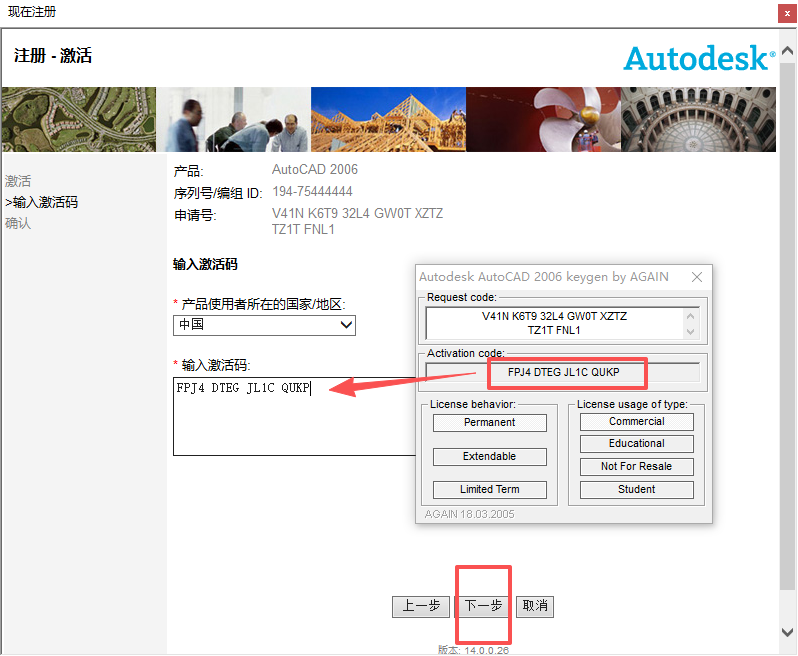 19、将自动生成号的激活码复制至激活码输入框内,点击【下一步】。