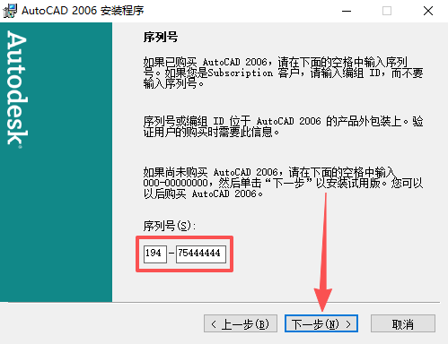 4、输入序列号【194-75444444】,点击【下一步】。