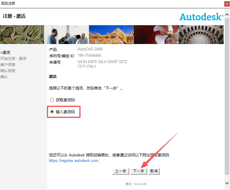16、选择【输入激活码】,点击【下一步】。
