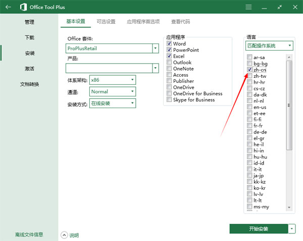4、软件下载好后,我们点击安装office一栏开始安装office,右边是组件选择,你可以随意挑选你要下载的office组件,设置下安装包架构(64位选x64,32位选x86),点击开始安装