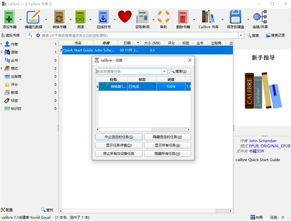 6、点击确定后就可以开始转换了,界面会返回到Calibre软件主界面,在界面右下角有任务选项,点击后就可以查看正在转换的文件,如下图所示,用户等待转换完成,就可以在之前设置的保存位置中找到转换后的文件,操作很简单,有需要的赶紧来下载使用吧。