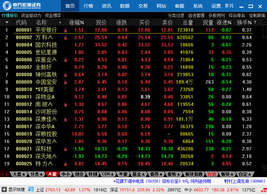 可显示自选股列表,通过功能键"添加、删除”进行自选股设置;可将自选股上下移动,可根据行情字段对自选股进行排序。