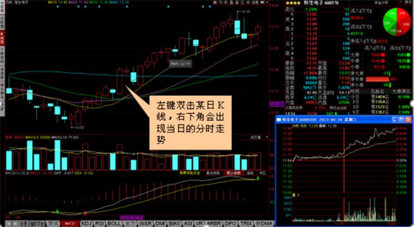 同时在 K 线界面,您可以单击历史上末日的线,在右下角会出现当日的历史分时走势图,方便查询回顾。
