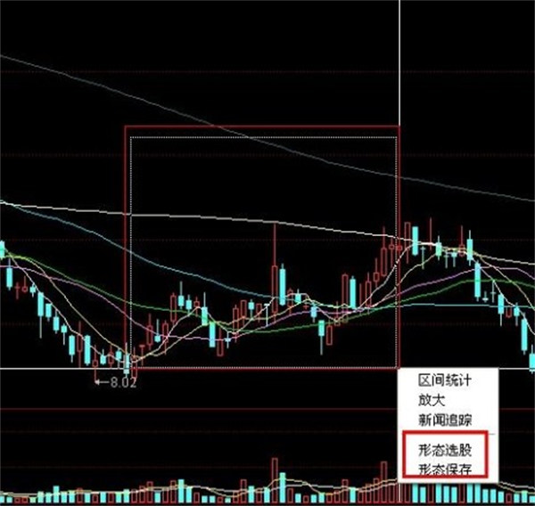 2、在 K 线图上,选择一段 K 线形态,按住鼠标右键拖动画框