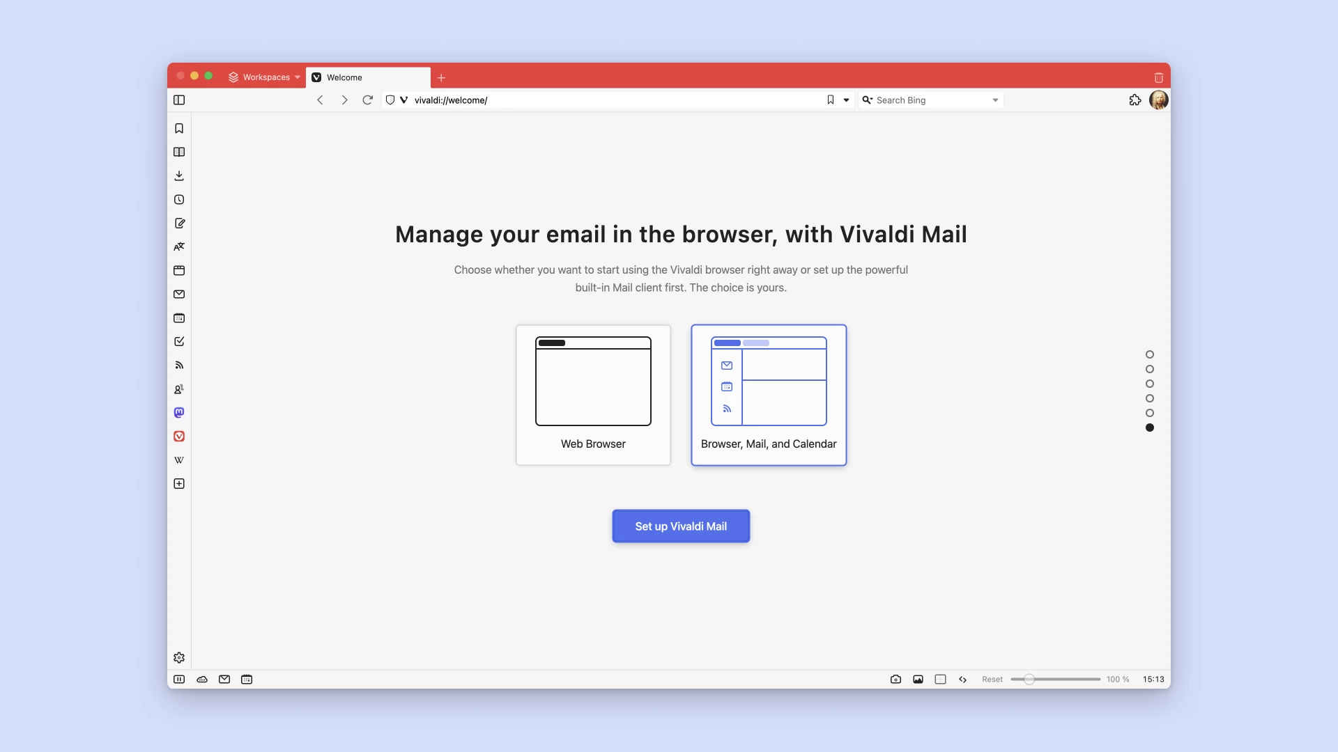 Vivaldi 为生产力而增压! 它内置了四个最受欢迎的生产力应用程序:一个真正的邮件客户端、一个私人日历、一个无算法的订阅阅读器和一个无法追踪的翻译工具。