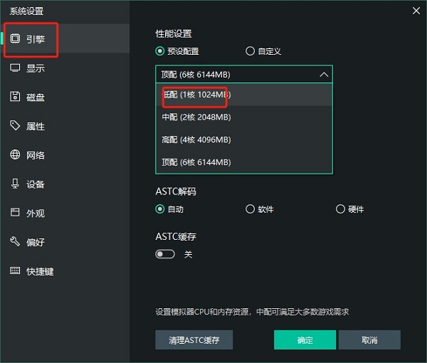 2、在设置页面中,点击左侧的【引擎】选项,随后在的【性能设置】的下拉列表点击打开,选择一个【低配】的性能,这样不会消耗太多流量,能够保证较流畅的运行。