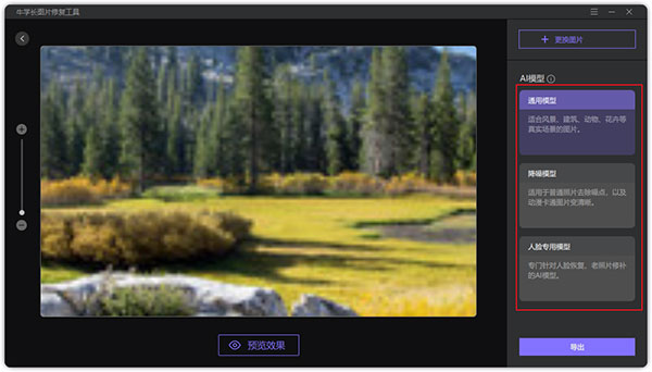 3、右侧选择适合您的AI智能修复模型,然后单击“预览”开始修复,由于工具在处理图片,您可能需要等待几秒钟;