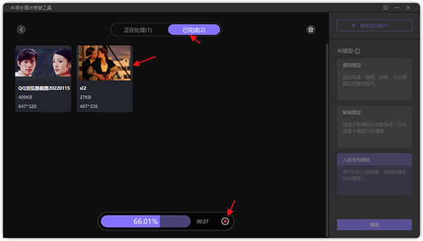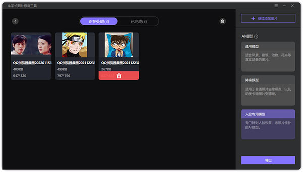 5、如果想要批量进行修复也是可以的,先拖入图片,然后右侧选择适合您的AI智能修复模型后,点击“导出”选择保存路径即开始修复照片;
