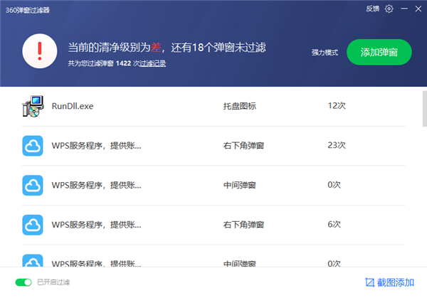 3、打开弹窗过滤界面后,用户可以直观的看到没有过滤的弹窗。