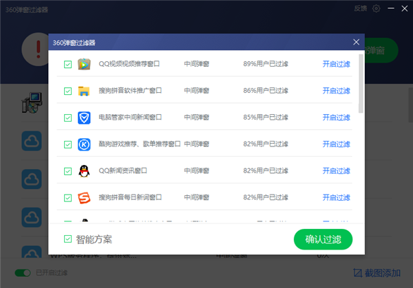 4、点击添加弹窗,把具有弹窗的软件点击确定过滤即可。